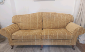 Condition is Used Fabric Antique Gold velvet Dimensions Full width 73 inches Cushions from end to end 53 inches Floor to top of cushions 14 inches Cushion to. Could do with a clean and one of the feet at the back is a little loose wobbly and needs fixing back into position. Too big for our new house downsizing.